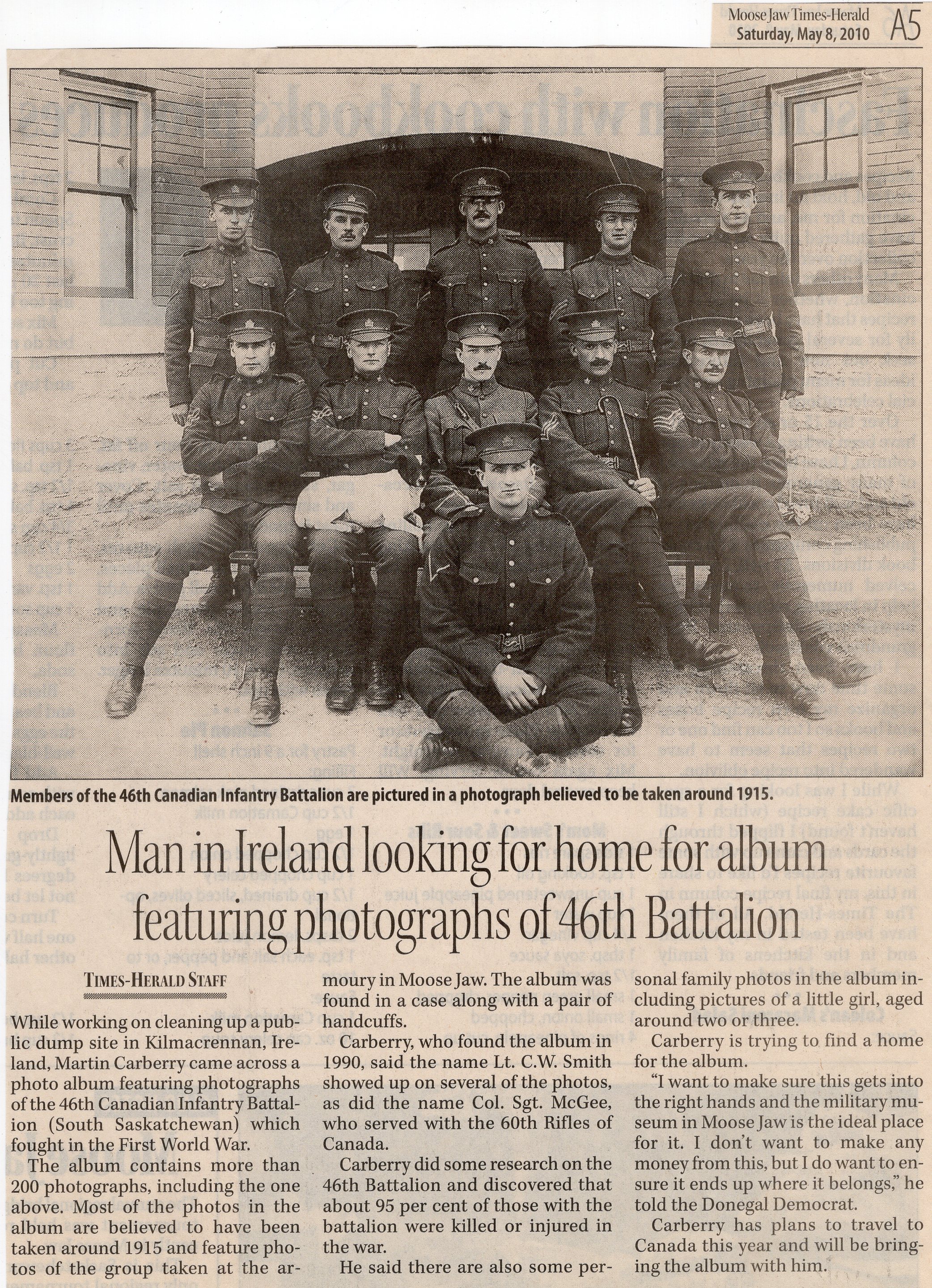 Regarding the photos, Martin Carberry said on 21Jun2022 "I found them around 25 years ago in a suit case while working for the local council at a garbage dump. I did some research and discovered they were the 46th pre going to war." "I am including attestation papers for officer Smith when he signed up for the 46th in Moose Jaw. As you can see he was a dentist by trade."