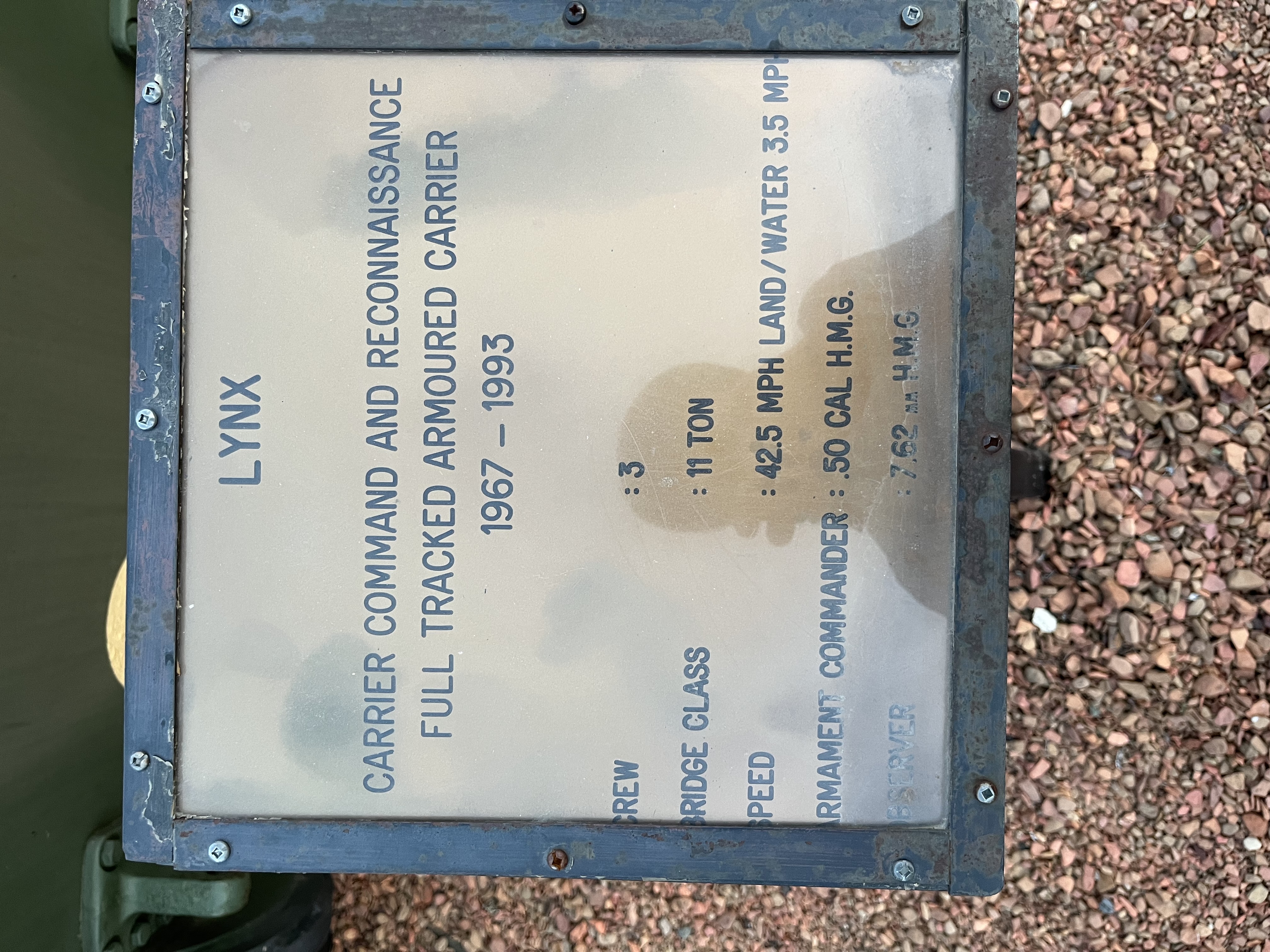 Ownership Lynx. Carrier command and reconnaissance full tracked armoured carrier. 1967-1993. Crew: 3. Bridge class: 11 ton. Speed: 42.5 mph land/water 3.5 mph. Armament commander: .50 cal H.M.G. Observer: 7.62 mm H.M.G.