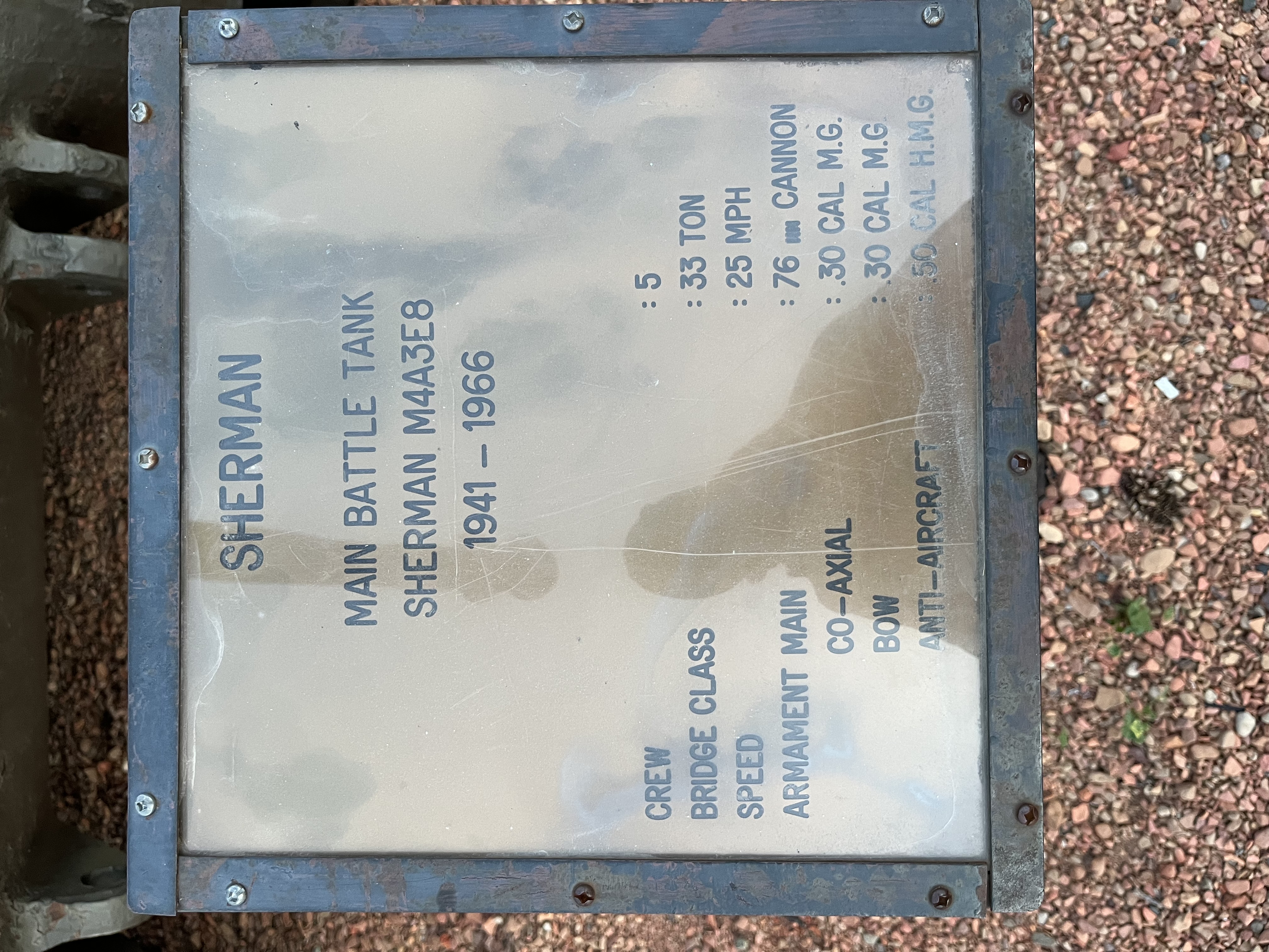 Ownership Sherman. Main battle tank. Sherman M4A3E8. 1941-1966. Crew: 5. Bridge class: 33 ton. Speed: 25 mph. Armament main: 76 mm cannon. Co-axial: .30 cal M.G. Bow: 30 cal M.G. Anti-aircraft: .50 cal H.M.G.