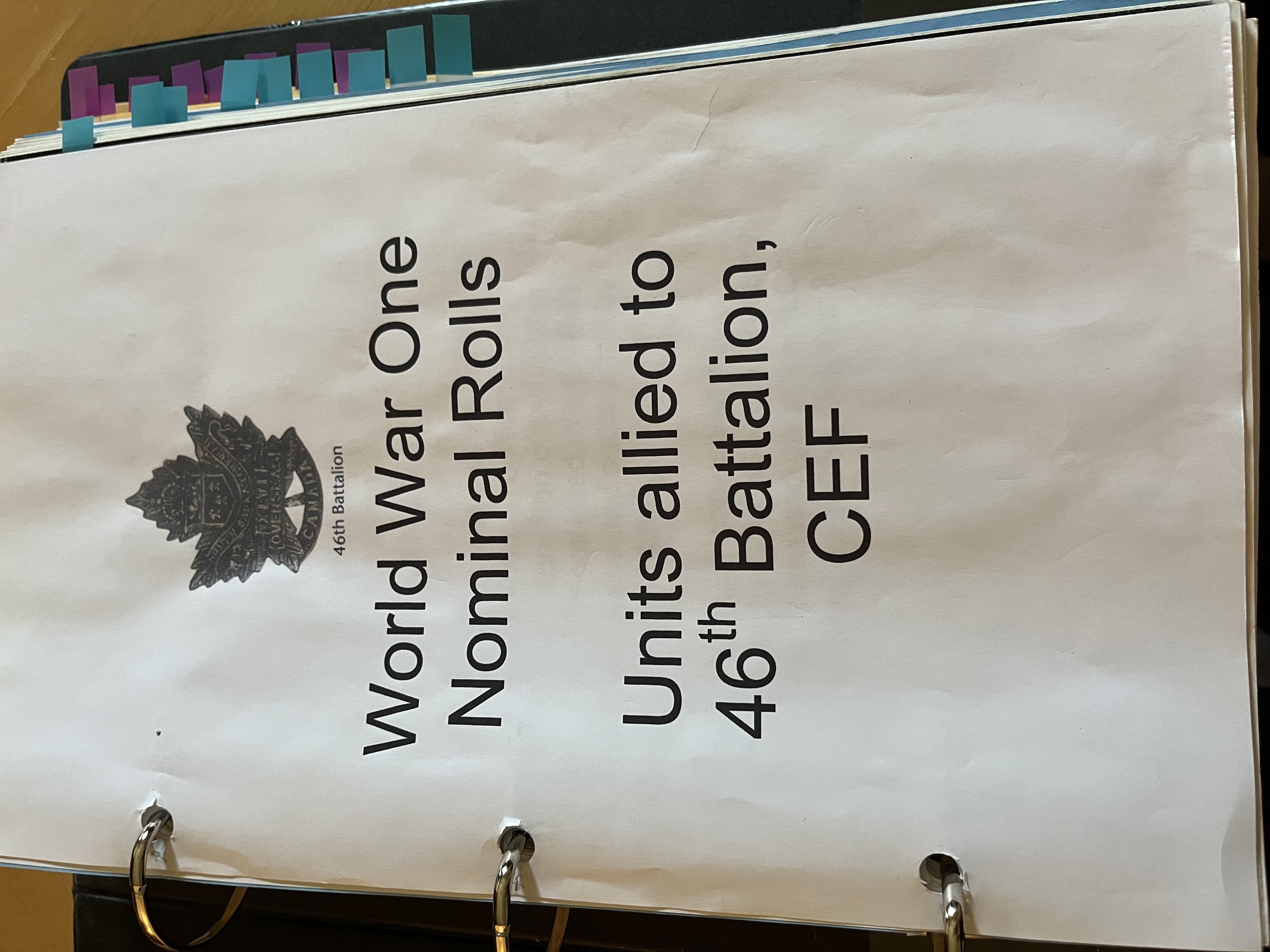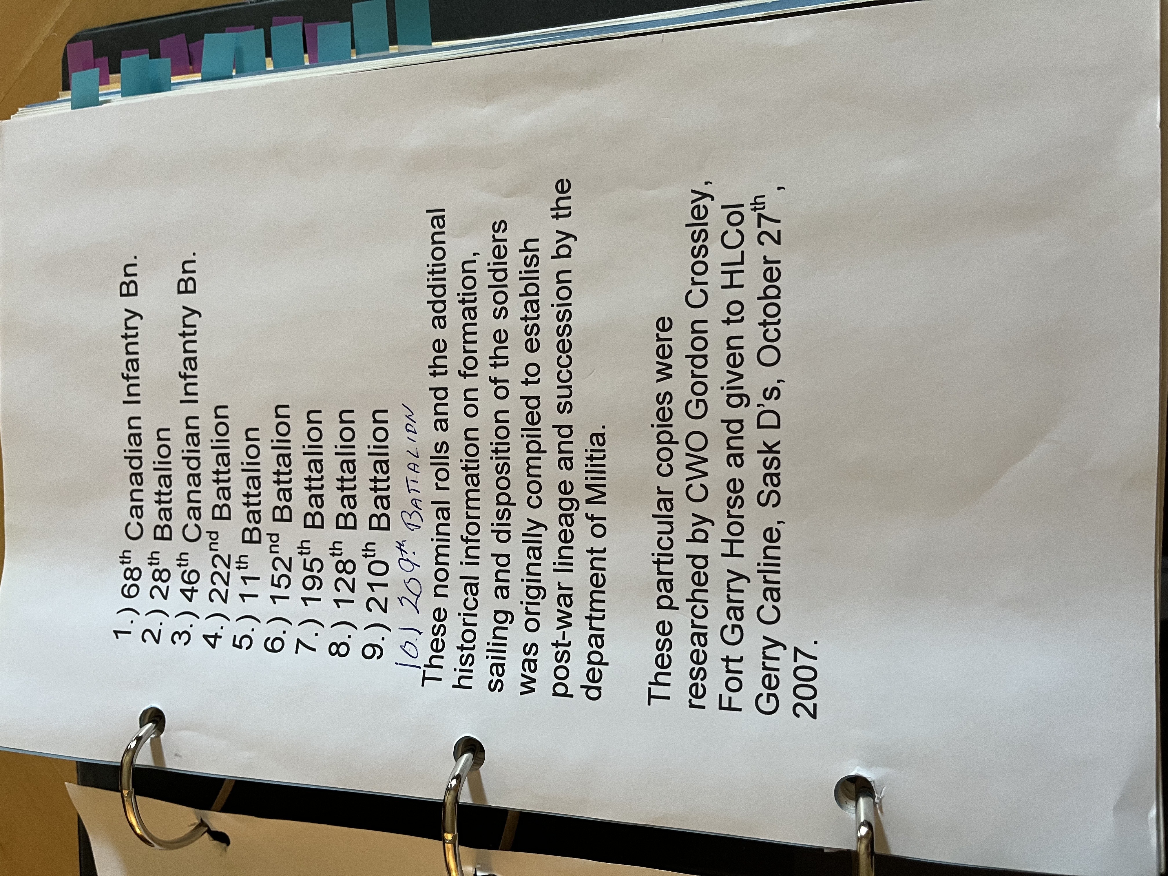 *"Researched by CWO Gordon Crossley, Fort Garry Horse and given to HLCol Gerry Carline, SaskD's October 27th, 2007." Opening statement in black binder housed in historical collection of the armoury. Binder title page, contents page.
